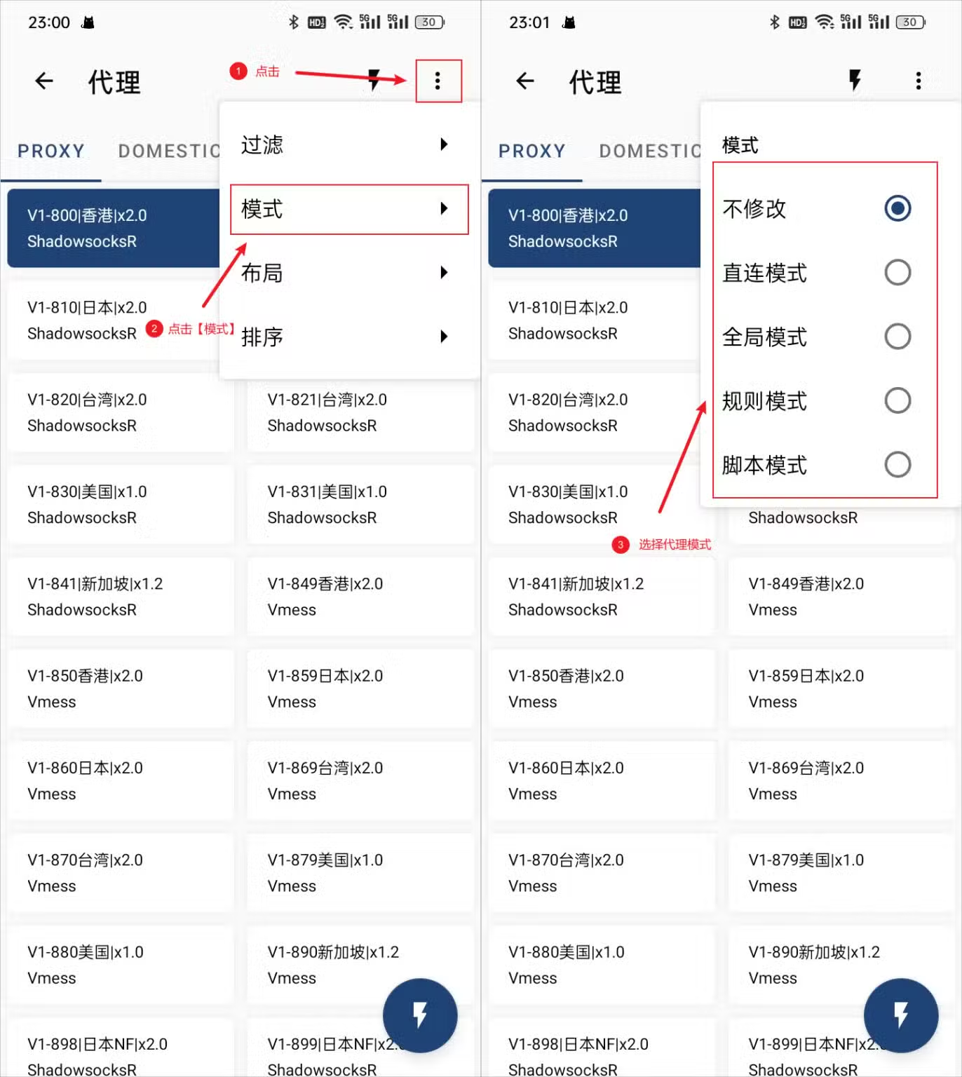点击代理页面左上角切换图标 → 选择代理模式: